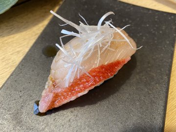 金目鯛を甘辛のタレ(煮付けのタレまたいな)にしゃぶしゃぶしてシャリに乗せていただきます。甘辛のタレもしゃぶしゃぶするとそれほどしつこくなく、とても美味しかったです!