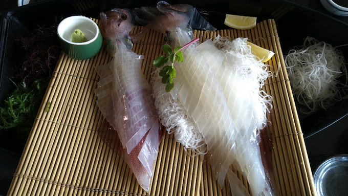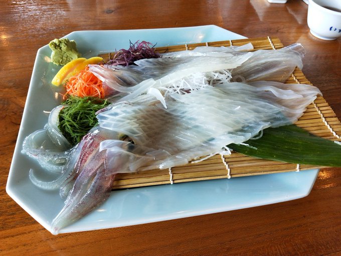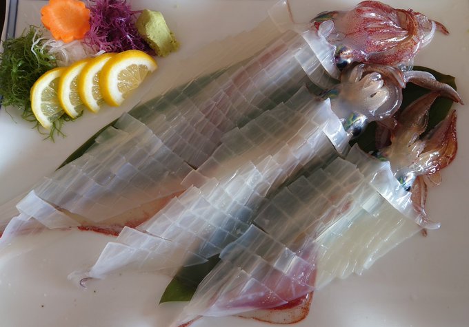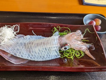 • 新鮮な活イカの刺身と天ぷらに舌鼓。